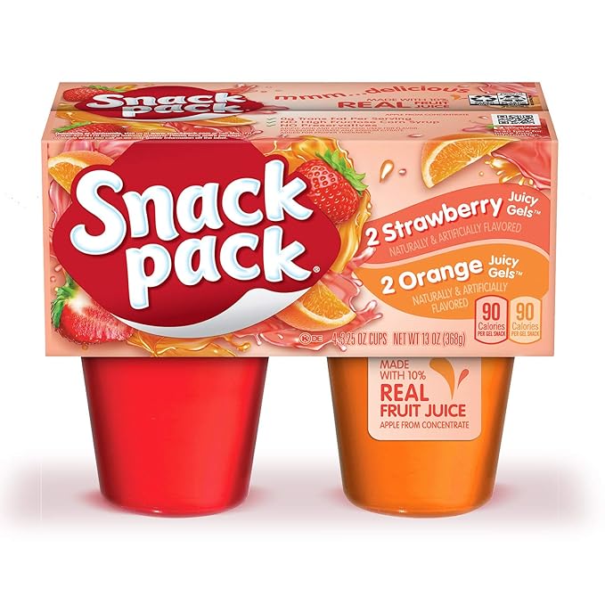 Snack Pack Strawberry and Orange Naturally and Artificially Flavored Juicy Gels are a fun snack or dessert that is delicious any time of the day. This gel snack features classic strawberry and orange flavor for an explosion of fruity flavor. Snack Pack Strawberry and Orange Juicy Gels are so full of flavor, they won’t make you miss the strawberry and orange gelatin cups you’ve had before. Not only are these sweet snacks delicious and convenient, but they are gluten free and contain no high fructose corn syrup. Snack Pack Juicy Gels cups are perfect for packing in a lunch so you can cap off your meal with a delicious sweet snack. These snack cups also make an easy after-dinner treat or dessert for the entire family. If you want to add some extra excitement to these gels cups, try using them for exciting recipes. Add whipped cream and sprinkles to make fun desserts. Each Snack Pack snack cup is a convenient size and does not need to be refrigerated.